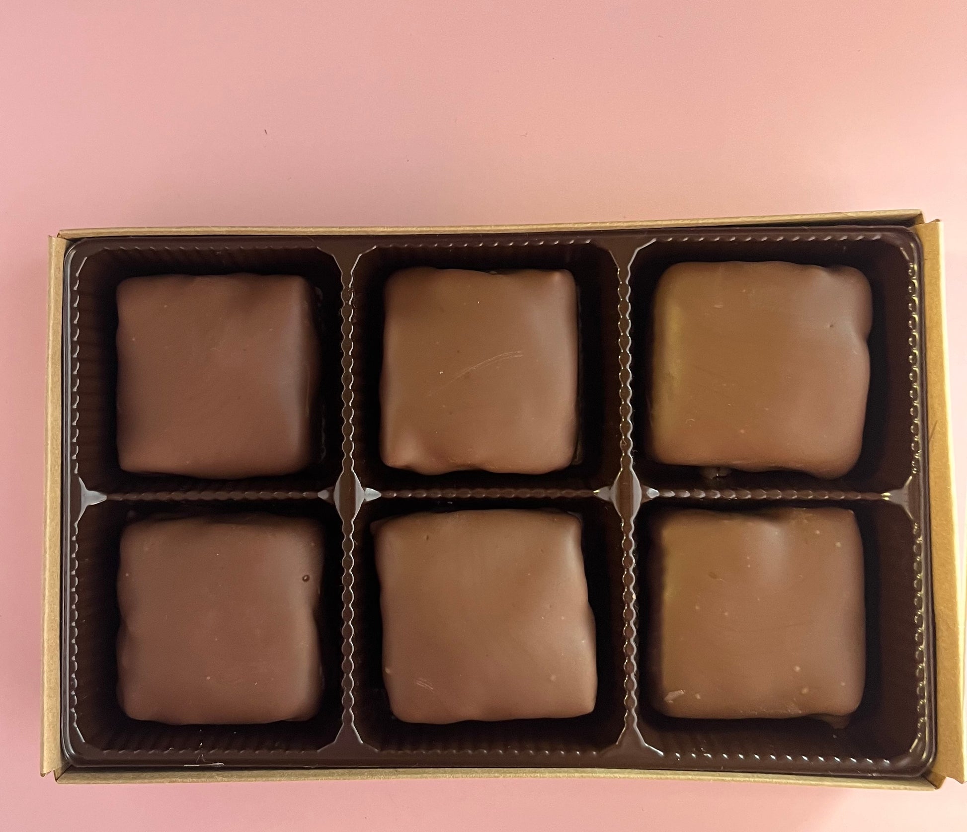 Crunchy pecans and rich caramel are covered in either milk or dark chocolate. There are 6 large pieces in our half-pound box.